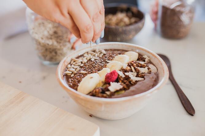 - Pour into your favourite bowl and top with all your favourites: seeds, frozen berries, sliced banana or maybe some specialty granola.