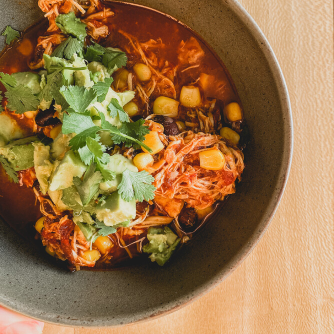 - add in drained can of black beans and cornServe:• serve up broth, chicken and beans / corn into a deep bowl