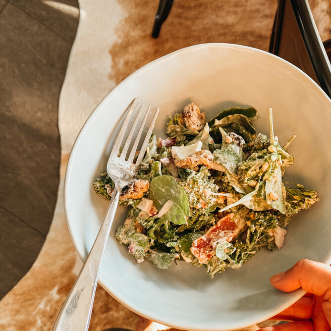 Last night I looked at the contents in the fridge and thought 'I wonder if I can use most of that to make a broccoli salad'. Here's what we used to make what turned out to be a very delicious and filling broccoli salad.