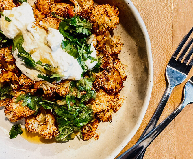 To serve, spoon whipped feta onto a serving plate, spreading it to cover the base. Top with roasted cauliflower (plus any paprika-stained oil from the tray) and coriander jalapeño salsa. Serve hot or at room temperature.
